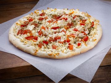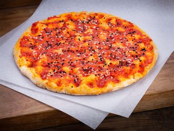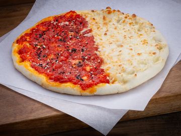 Freshly baked flatbread with a pepper paste base, topped with crushed tomatoes and melted cheese.