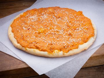 Freshly baked flatbread with a pepper paste base, topped with crushed tomatoes for a rich, savoury bite.