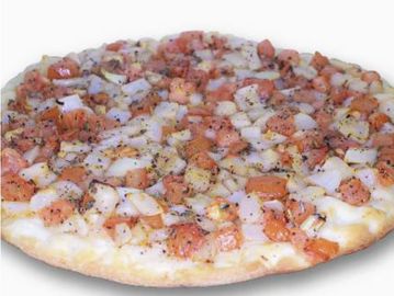Golden flatbread spread with ZnC house sauce and topped with sautéed onions and peppers.