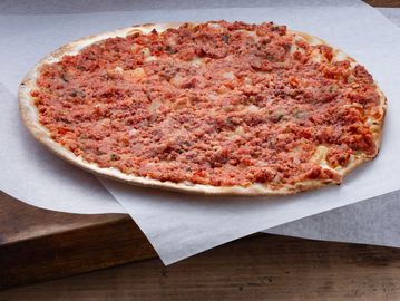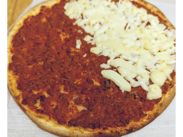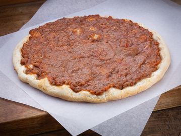 Golden flatbread layered with halal flavourful ground sausage, baked to perfection.